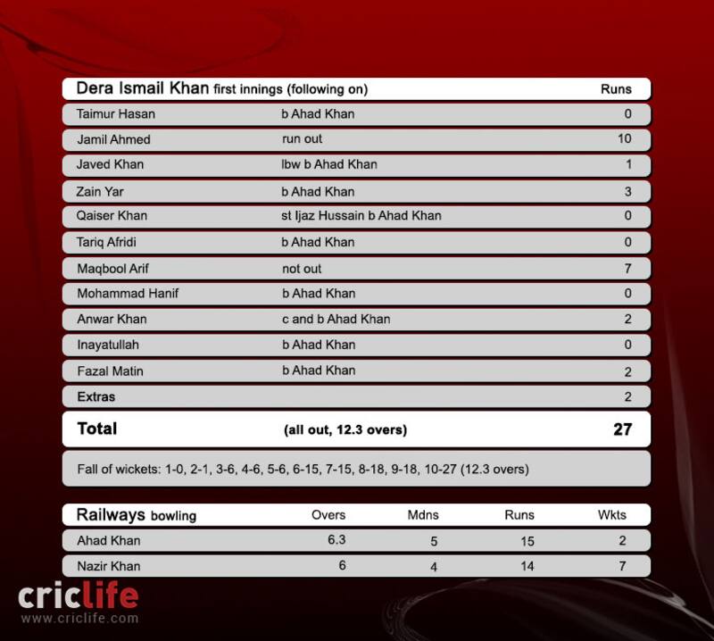 This time Ahad reduced Dera Ismail Khan to six for five before Jamil Ahmed played spoilsport and got run out. Ahad rounded things off with figures of 6.3-4-7-9 as Dera Ismail slumped to 27. They lasted a mere 28 overs across the innings. In each innings they could not outscore the number of extras they conceded (39).