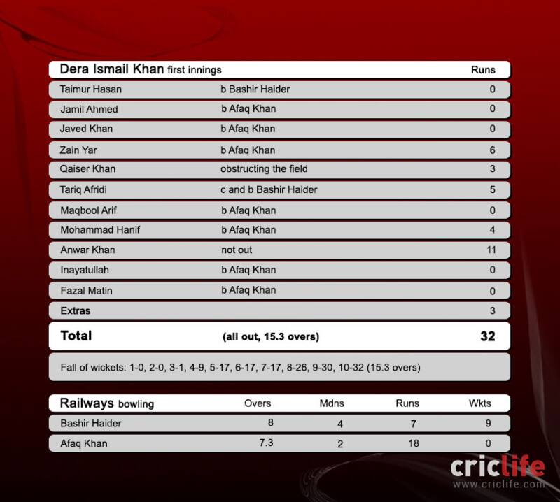 Dera Ismail Khan, in response, were reduced to 17 for seven before Anwar Khan walked out to score a gritty unbeaten 11: they were bowled for 32 by Afaq Khan (seven for 14) and Bashir Haider, who bowled unchanged. Bashir put Dera Ismail Khan again, but changed bowlers this time, asking Ahad Khan and Nazir Khan to share the new ball.