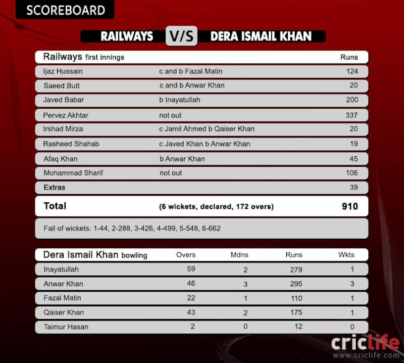 Of the eight batsmen, Pervez Akhtar top-scored with 337 not out, while Javed Babar scored a round 200. Ijaz Hussain and Mohammad Sharif also notched up hundreds. An even more astonishing aspect was the scoring rate: Railways scored at 5.29 runs an over.