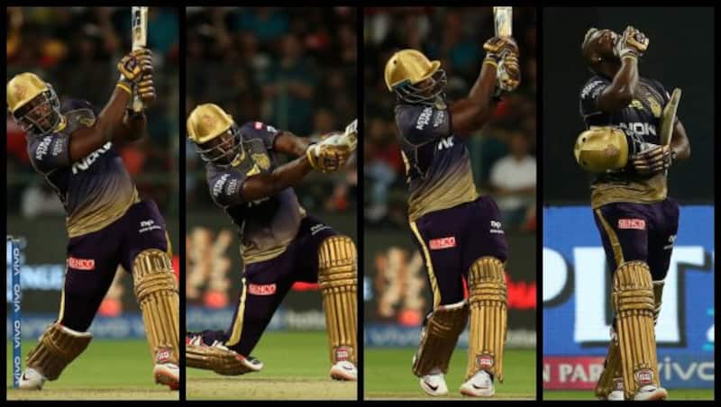 बैंगलुरू के दिए 205 रनों के लक्ष्य का पीछा करते हुए कोलकाता टीम ने 140 के स्कोर पर चार विकेट खो दिए थे, जिसके बाद बल्लेबाजी करने आए आंद्रे रसेल। रसेल ने अपने स्वाभाविक अंदाज की तुलना में बेहद धीमी शुरुआत की। उन्होंने 17 ओवर के तक उन्होंने केवल 2 गेंद पर एक ही रन बनाया था लेकिन डेथ ओवर्स में जब बैंगलुरू टीम को अपनी जीत करीब लगने लगी, रसेल ने गियर बदला और छक्कों की बरसात कर दी।
