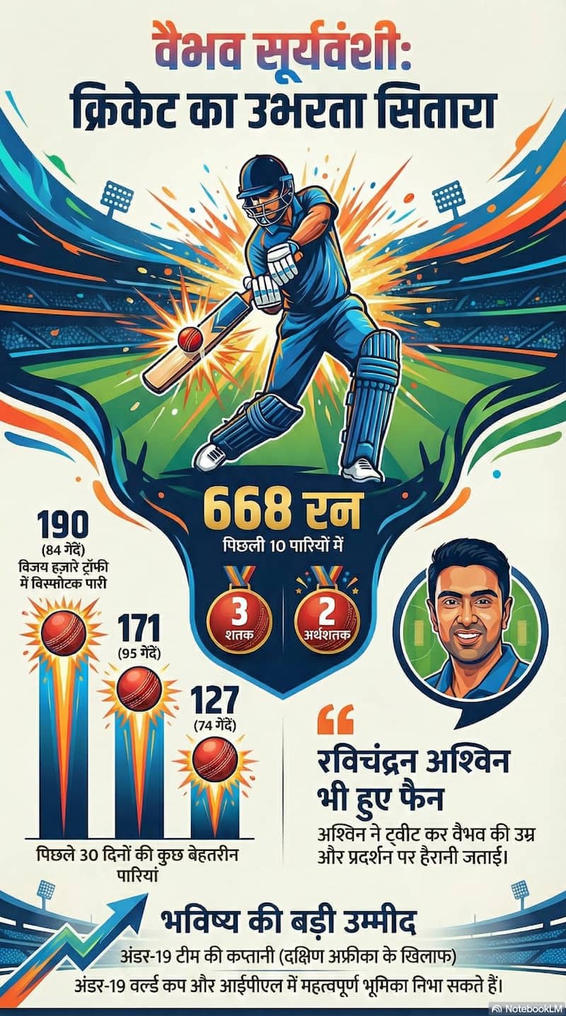 वैभव सूर्यवंशी की उम्र सिर्फ 14 साल है. लेकिन उनके कारनामे बहुत बड़े हो चुके हैं. उनके नाम की चर्चा हर जगह है. अगर आप एक भारतीय क्रिकेट फैन से पूछें तो वह फौरन सूर्यवंशी को भारतीय टीम में लाने की वकालत करेगा. मैदान बदलते रहे, टूर्नामेंट बदलते रहे और गेंदबाज बदलते रहे, लेकिन अगर कुछ नहीं बदला है तो वह सूर्यवंशी के खेलने का अंदाज. आक्रामक, प्रभावशाली और अपनी उपस्थिति दर्ज करवाता हुआ. बाएं हाथ के इस ‘नन्हे’ से बल्लेबाज ने जहां भी खेला, वहां विपक्षी टीम में एक खौफ पैदा किया. और ऐसी-ऐसी पारियां खेलीं कि सुर्खियां बनीं. अब भारतीय टीम के पूर्व ऑफ स्पिनर रविचंद्रन अश्विन ने भी उन्हें लेकर ट्वीट किया.अश्विन ने सूर्यवंशी की सिर्फ एक महीने की बल्लेबाजी के आंकड़े बताते हुए हैरानी जताई है. बीते 30 दिनों में ही अलग-अलग फॉर्मेट, अलग-अलग मैदानों और अलग-अलग देशों में भी वैभव तबाही मचा रहे हैं. विजय हजारे ट्रॉफी से लेकर अंडर-19 क्रिकेट में साउथ अफ्रीका के खिलाफ बतौर कप्तान भी, उन्होंने कई कमाल की पारियां खेलीं. साउथ अफ्रीका अंडर-19 में तो वह भारत के कप्तान भी रहे.