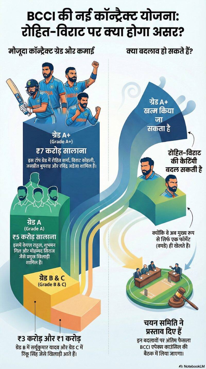 फिलहाल, सीनियर खिलाड़ी रोहित शर्मा, विराट कोहली, जसप्रीत बुमराह और रविंद्र जडेजा ए प्लस कैटेगरी में शामिल हैं. हालांकि, यह देखना दिलचस्प होगा कि कोहली और रोहित, जो केवल वनडे खेलते हैं, और जडेजा, जो टेस्ट और वनडे खेलते हैं, सालाना रिटेनर के टॉप टियर में बने रहेंगे या नहीं, खासकर अगर सिस्टम में बदलाव होता है. यह भी चर्चा की जा रही है कि शायद इन खिलाड़ियों को ए प्लस कैटेगिरी में न रखा जाए.