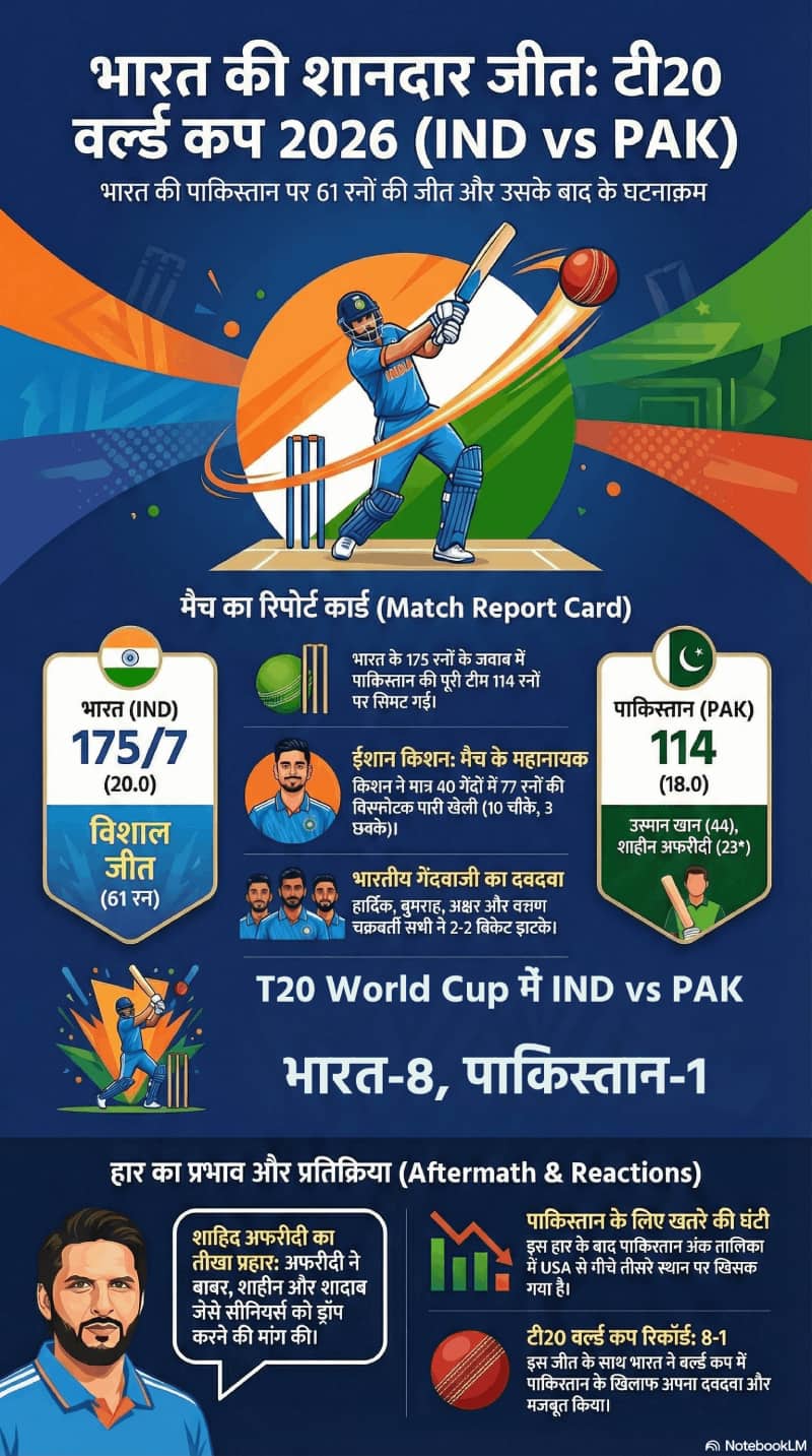 भारतीय पारी के हीरो ईशान किशन रहे. उन्होंने 40 गेंद पर 77 रन की पारी खेली. इसके बाद गेंदबाजी में भारत ने पाकिस्तान को पहले ओवर से ही मौका नहीं दिया. हार्दिक पंड्या ने साहिबजादा फरहान को खाता भी नहीं खोलने दिया. और अगले ओवर में जसप्रीत बुमराह ने दो विकेट लेकर पाकिस्तान की पारी को पटरी से ही उतार दिया.