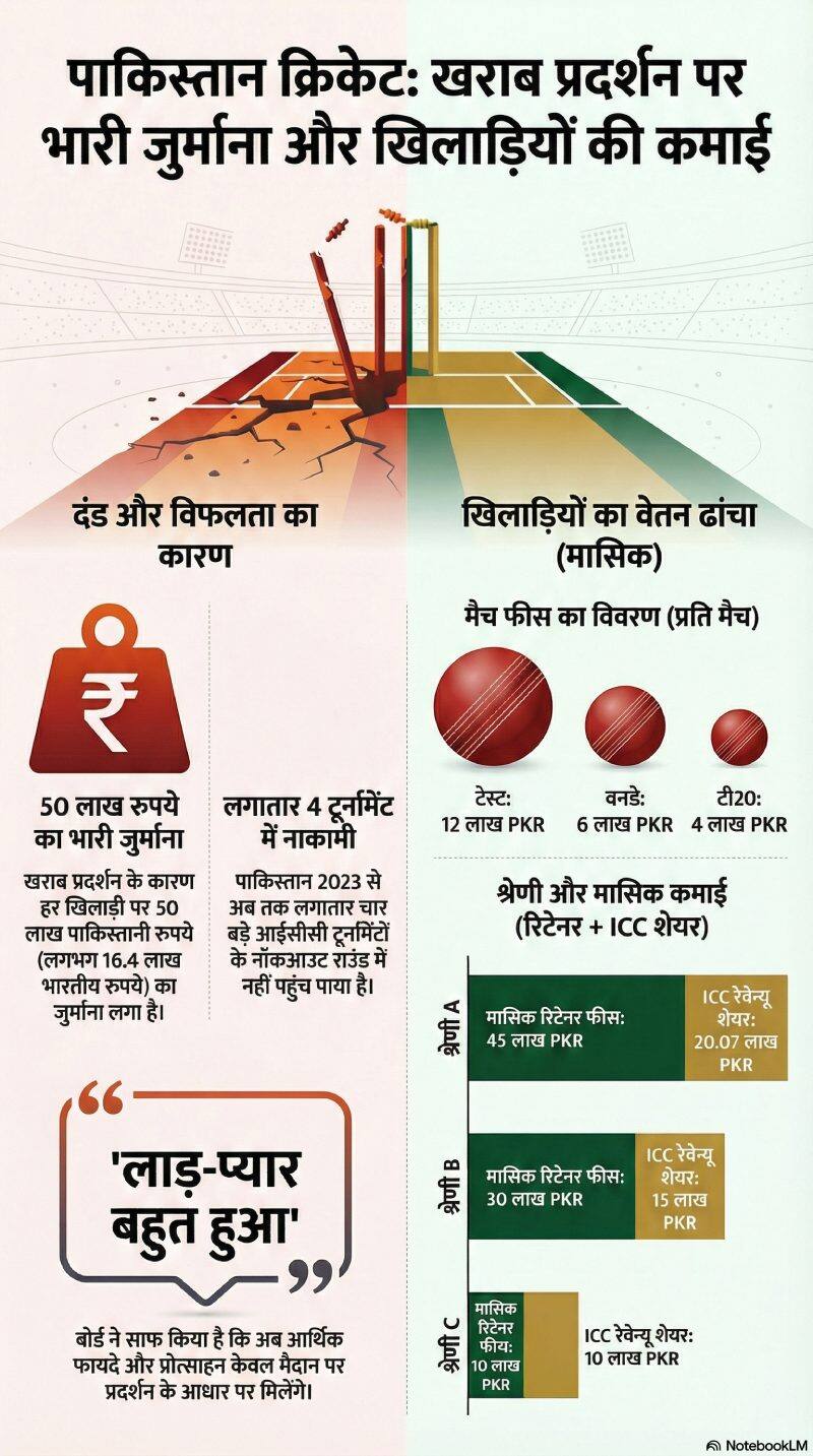 असल में भारत और श्रीलंका में टी20 वर्ल्ड कप 2026 खेला जा रहा है. और पाकिस्तान क्रिकेट टीम इसके सेमीफाइनल में नहीं पहुंच पाई है. इसी से नाराज होकर बोर्ड ने अपने खिलाड़ियों पर आर्थिक जुर्माना लगाया है. यह लगातार चौथा आईसीसी टूर्नामेंट- 2023 वनडे वर्ल्ड कप, 2024 टी20 वर्ल्ड कप, 2025 चैंपियंस ट्रॉफी और अब यह टी20 वर्ल्ड कप- है जहां पाकिस्तान की टीम नॉकआउट तक नहीं पहुंच पाई है. और इसे लेकर पाकिस्तान क्रिकेट टीम की खूब आलोचना हो रही है.