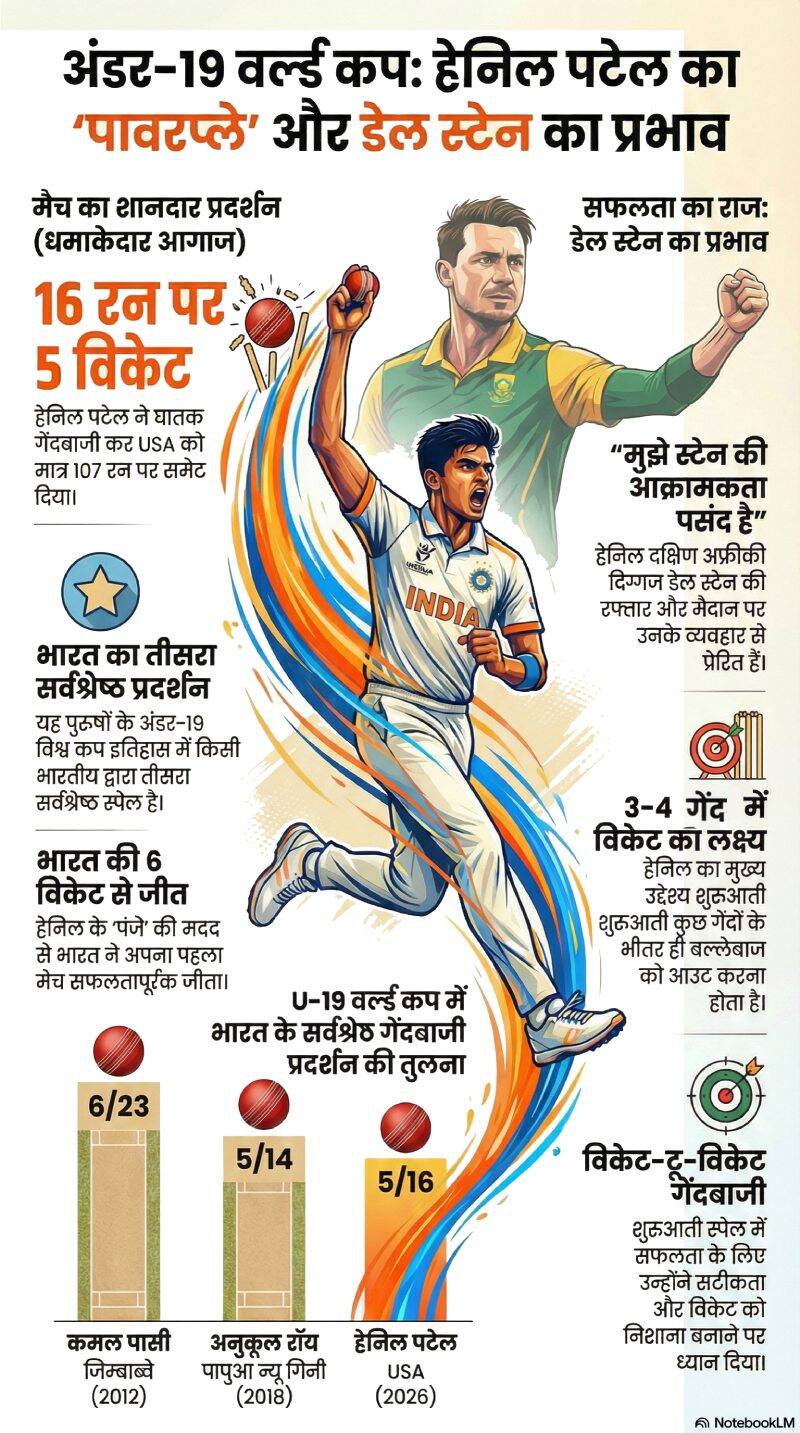 भारत ने अंडर-19 वर्ल्ड कप में जीत के साथ शुरुआत की. गुरुवार को खेले गए अपने पहले मैच में उसने संयुक्त राज्य अमेरिका को छह विकेट से हराया. भारत की इस जीत में हेनिल पटेल की अहम भूमिका रही. हेनिल ने 5 विकेट लेकर भारत की जीत की पटकथा लिखी. उनकी गेंदबाजी की मदद से भारत ने USA को 107 रन पर समेट दिया. हेनिल से जब पूछा गया कि आखिर उनकी प्रेरणा क्या है तो उन्होंने डेल स्टेन का नाम लिया.