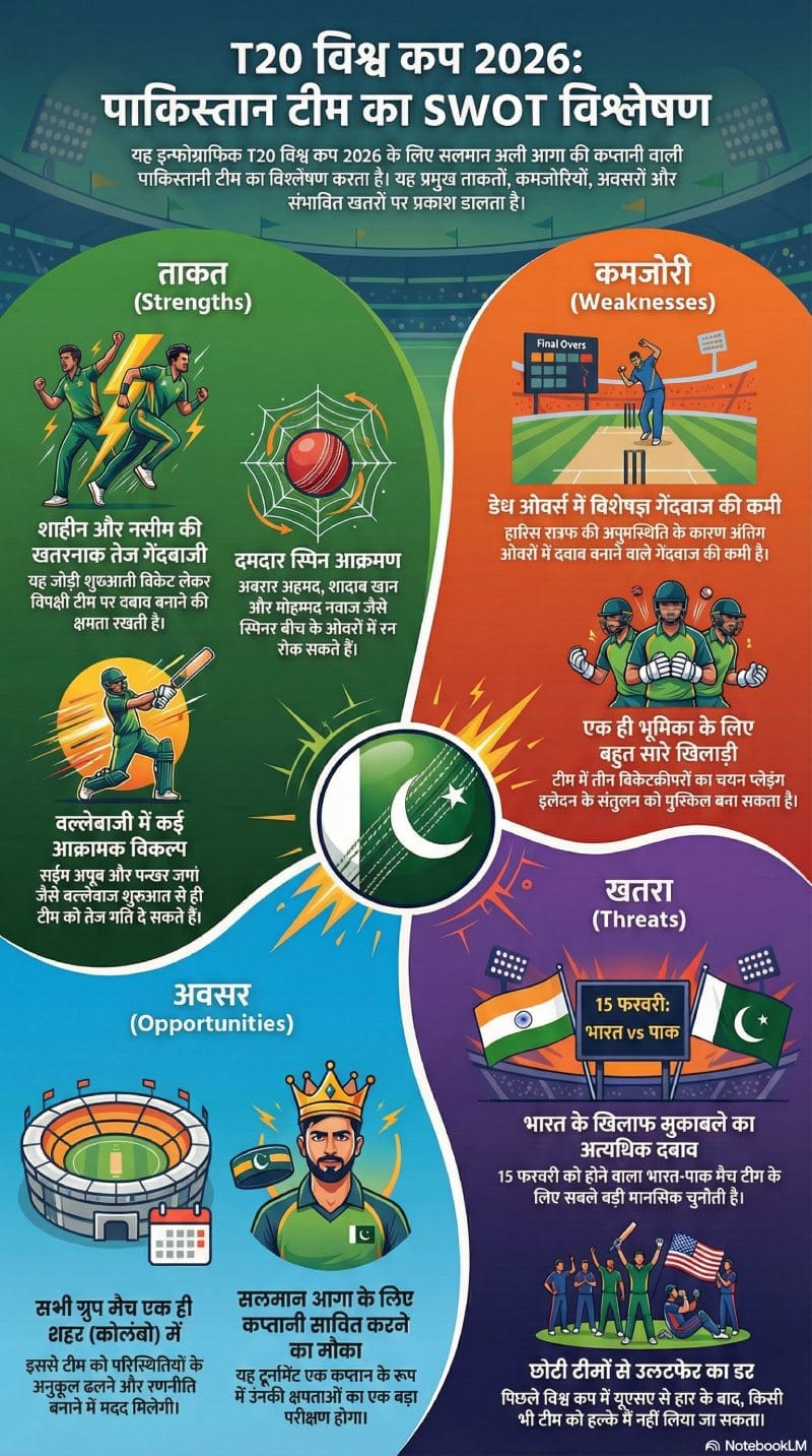 भारत के खिलाफ मुकाबले के दबाव से निकलना होगा. भारत और पाकिस्तान के बीच 15 फरवरी को मैच होगा. और पाकिस्तान की टीम के लिए सबसे बड़ा खतरा वही मुकाबला है. और इसके साथ ही नेट रनरेट भी काफी अहम हो सकती है. पाकिस्तान की टीम पिछले वर्ल्ड कप में यूएसए से हार चुकी है. इसके साथ ही नीदरलैंड की टीम को भी हल्के में नहीं लिया जा सकता. पाकिस्तान जानता है कि एक खराब नतीजा और उसके लिए परेशानियां बढ़ जाएंगी.