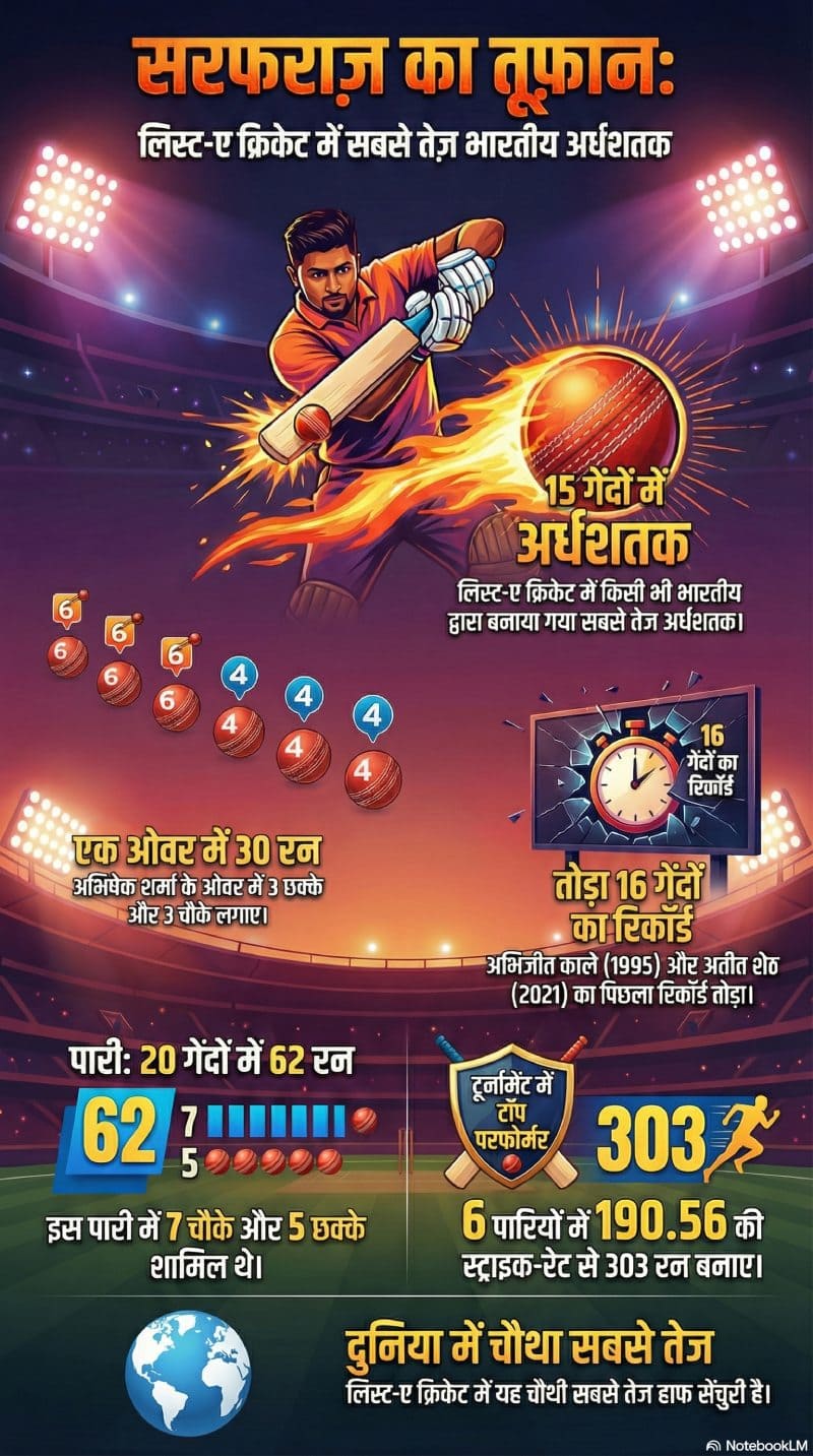सरफराज खान ने विजय हजारे ट्रॉफी 2025-26 में सिर्फ 15 गेंद पर हाफ सेंचुरी बना दी. पंजाब के खिलाफ उन्होंने यह कमाल की पारी खेली. यह लिस्ट-ए क्रिकट में किसी भारतीय बल्लेबाज द्वारा बनाई गई सबसे तेज हाफ सेंचुरी है.