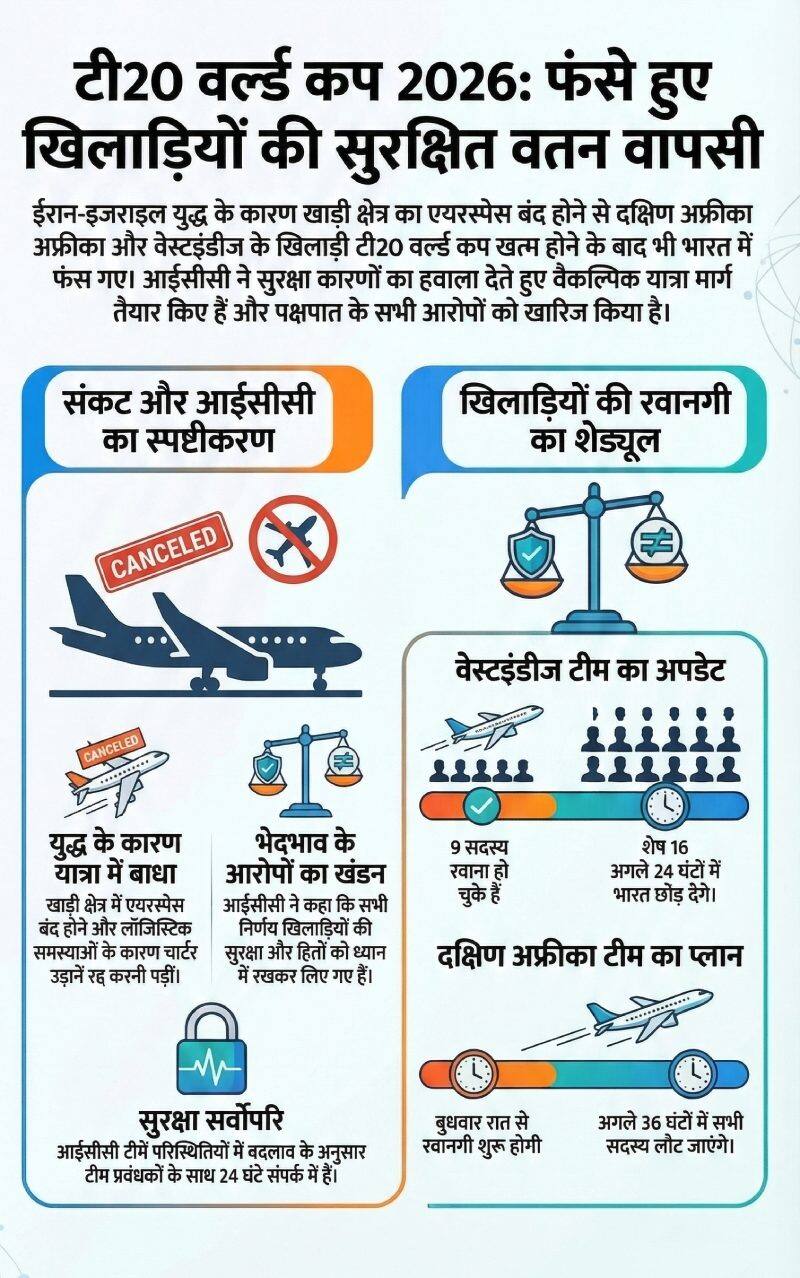 आईसीसी ने यात्रा कार्यक्रमों के बारे में जानकारी भी दी. और कहा कि बुधवार रात से साउथ अफ्रीका के खिलाड़ी स्वदेश रवाना होना शुरू कर देंगे. और साथ ही यह भी उम्मीद जताई कि अगले 36 घंटों के भीतर बाकी सदस्य भी रवाना हो जाएंगे. आईसीसी ने बताया कि वेस्टइंडीज टीम के नौ सदस्य पहले ही अपने देशों के लिए रवाना हो चुके हैं, जबकि बाकी 16 सदस्यों के लिए अगले 24 घंटों के भीतर भारत से रवाना होने वाली उड़ानों में बुकिंग करा ली गई है.