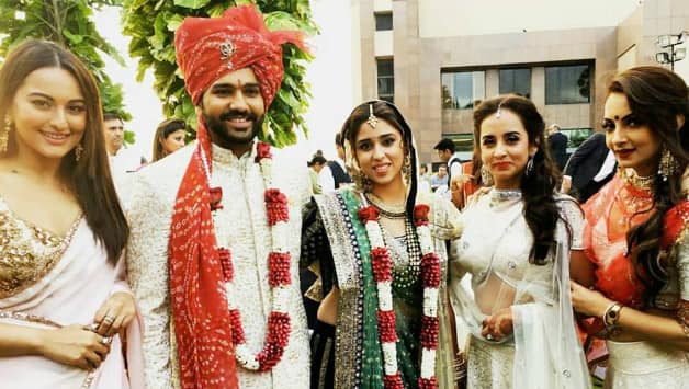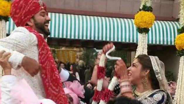 रितिका साजदेह, रोहित को जयमाला पहनाने का प्रयास करती हुईं, रोहित के मित्र उन्हें ऊपर उठाए हुए Photo Courtesy: Twitter: @ImRo45_FC Rohit Sharma fan page