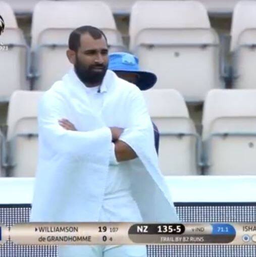 स्टार तेज गेंदबाज मोहम्मद शमी न्यूजीलैंड के खिलाफ फील्डिंग के दौरान तौलिया लपेटे नजर आए.