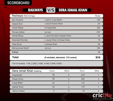 Railways declared at 910 for six on the third morning, and bowled out Dera Ismail Khan for 32 and 27 on the same day to register a win by an innings and 851 runs — easily the biggest margin of victory in First-Class defeat.